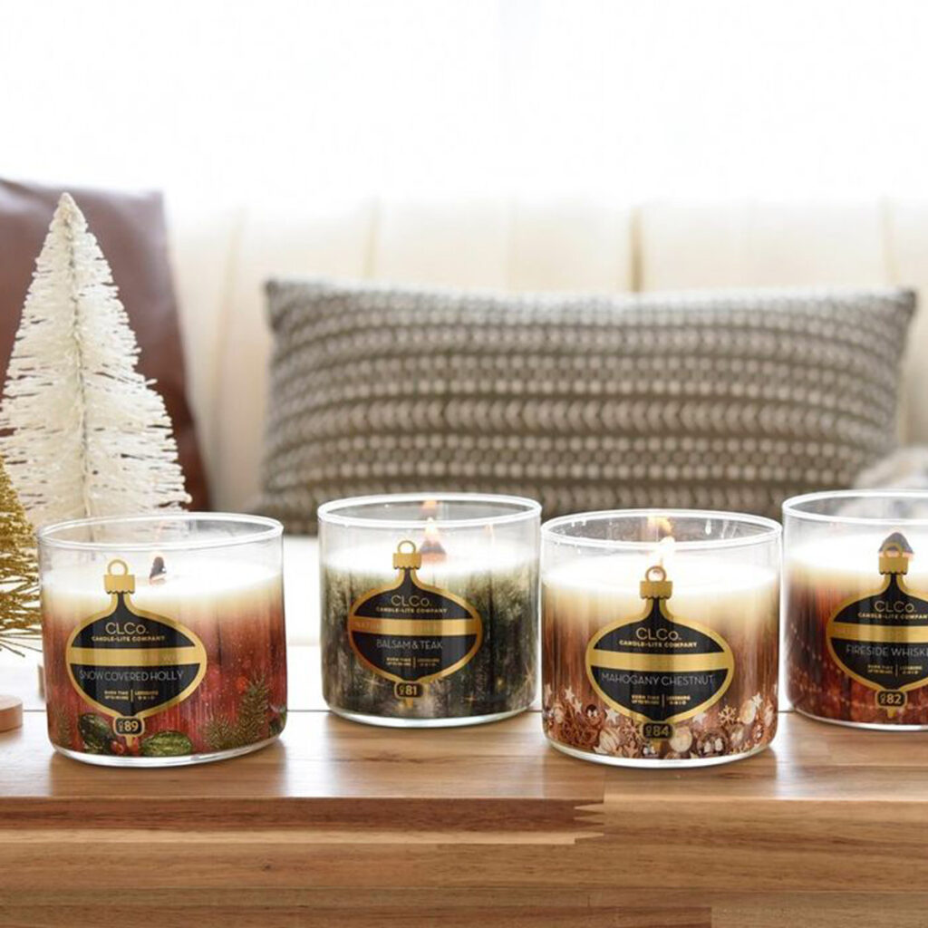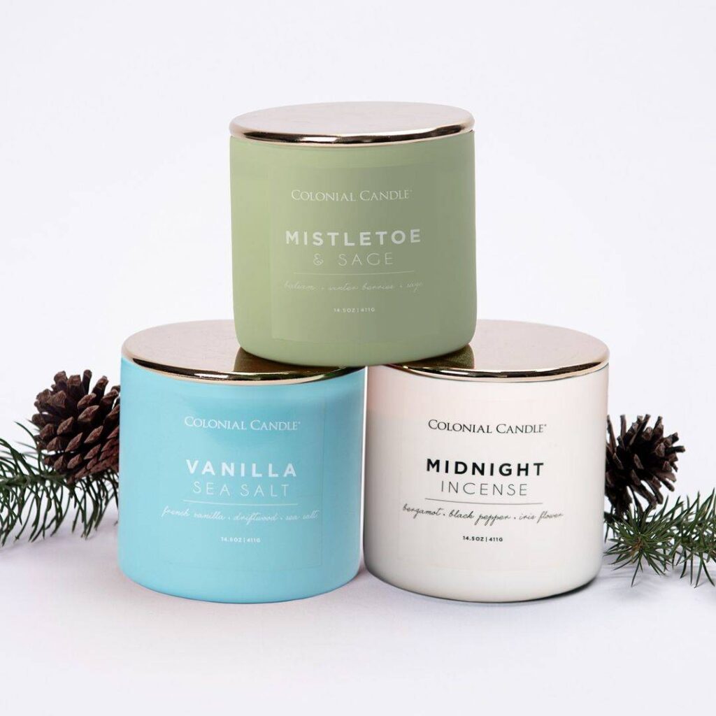 Kolekcje Everyday Luxe oraz Luxe to duże sojowe świece zapachowe z drewnianym knotem w kolorowym szkle z drewnianą przykrywką oraz świece z trzema knotami.
