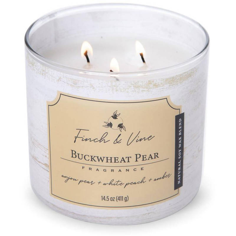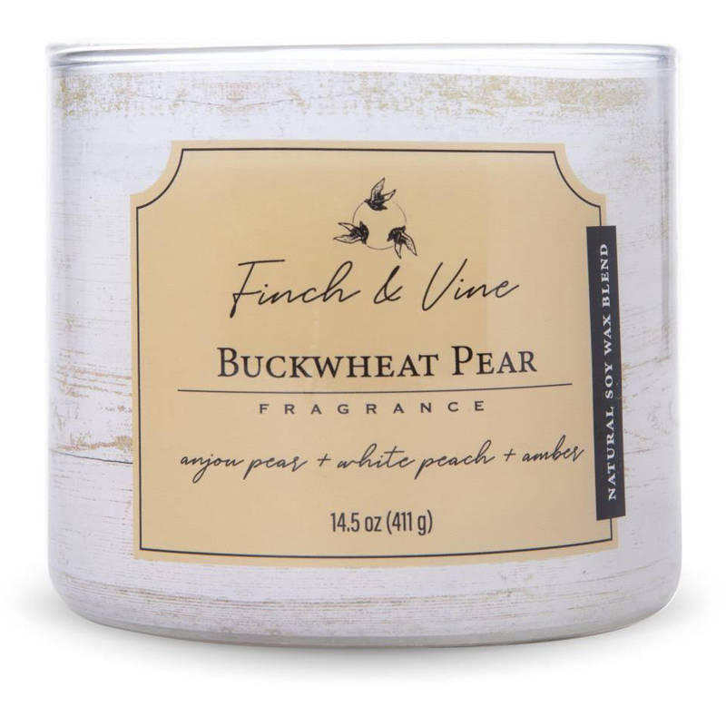 Zapach dużej świecy sojowej Buckwheat Pear od Colonial Candle z kolekcji Finch & Vine inspirowanej rustykalnymi wiejskimi klimatami stworzy wyjątkowy nastrój dzięki połączeniu wyrazistych kolorów i intensywnych zapachów. Elegancka sojowa świeca zapachowa z trzema knotami w okrągłym szkle z drewnianą przykrywką o zapachu Buckwheat Pear.